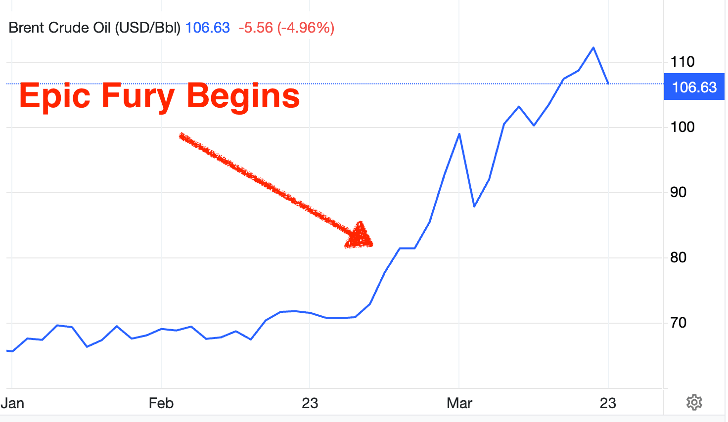 On January 1 of this year, Brent crude oil traded for $60 per barrel. The first trading day after Operation Epic Fury was launched in Iran, it rose to $82. By this past weekend, it peaked at $113.