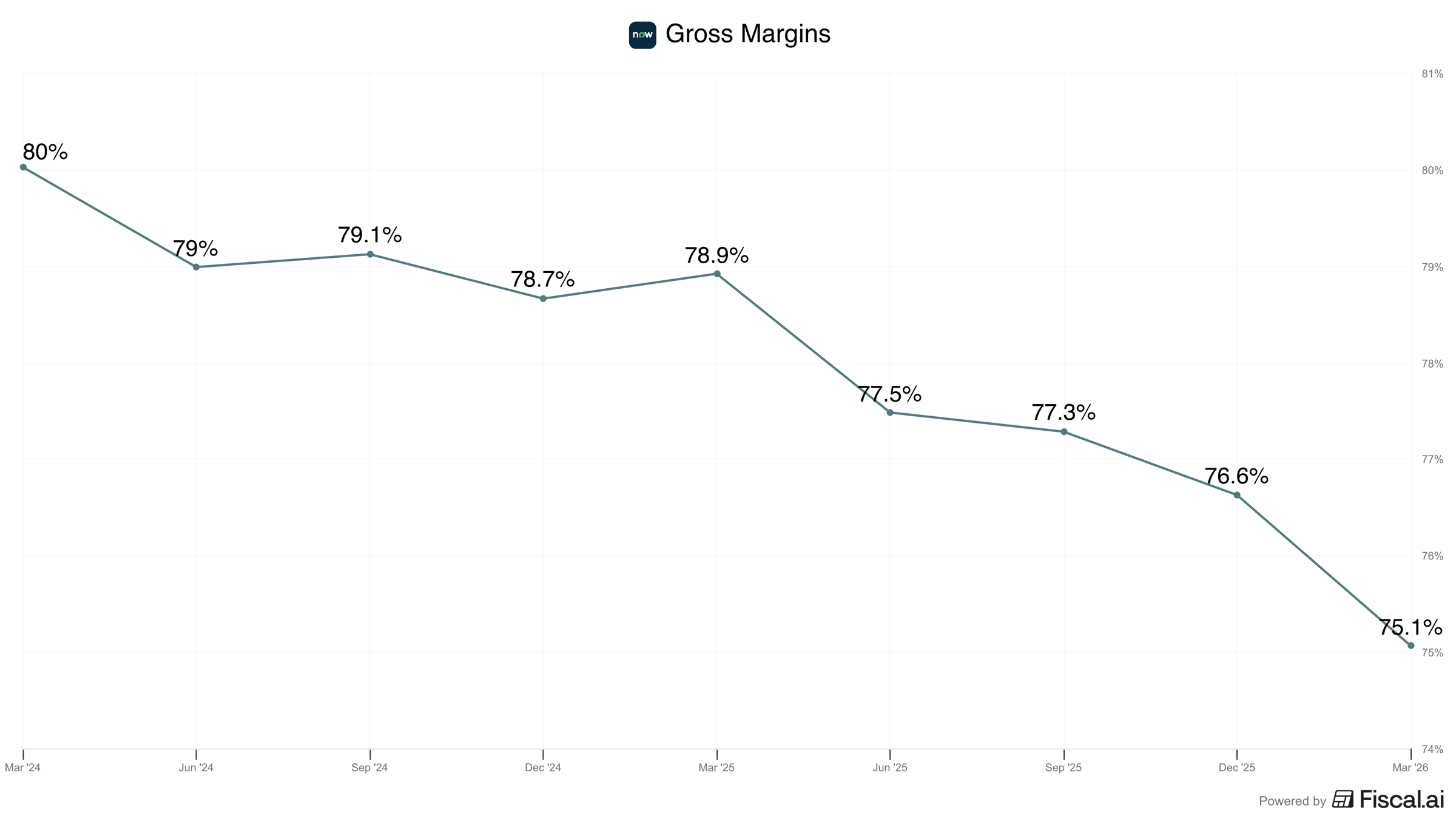 - However, the margin profile has deteriorated: gross margins have contracted 490 basis points in two years (see below). There is concern that, as NowAssist grows, that trend will continue.